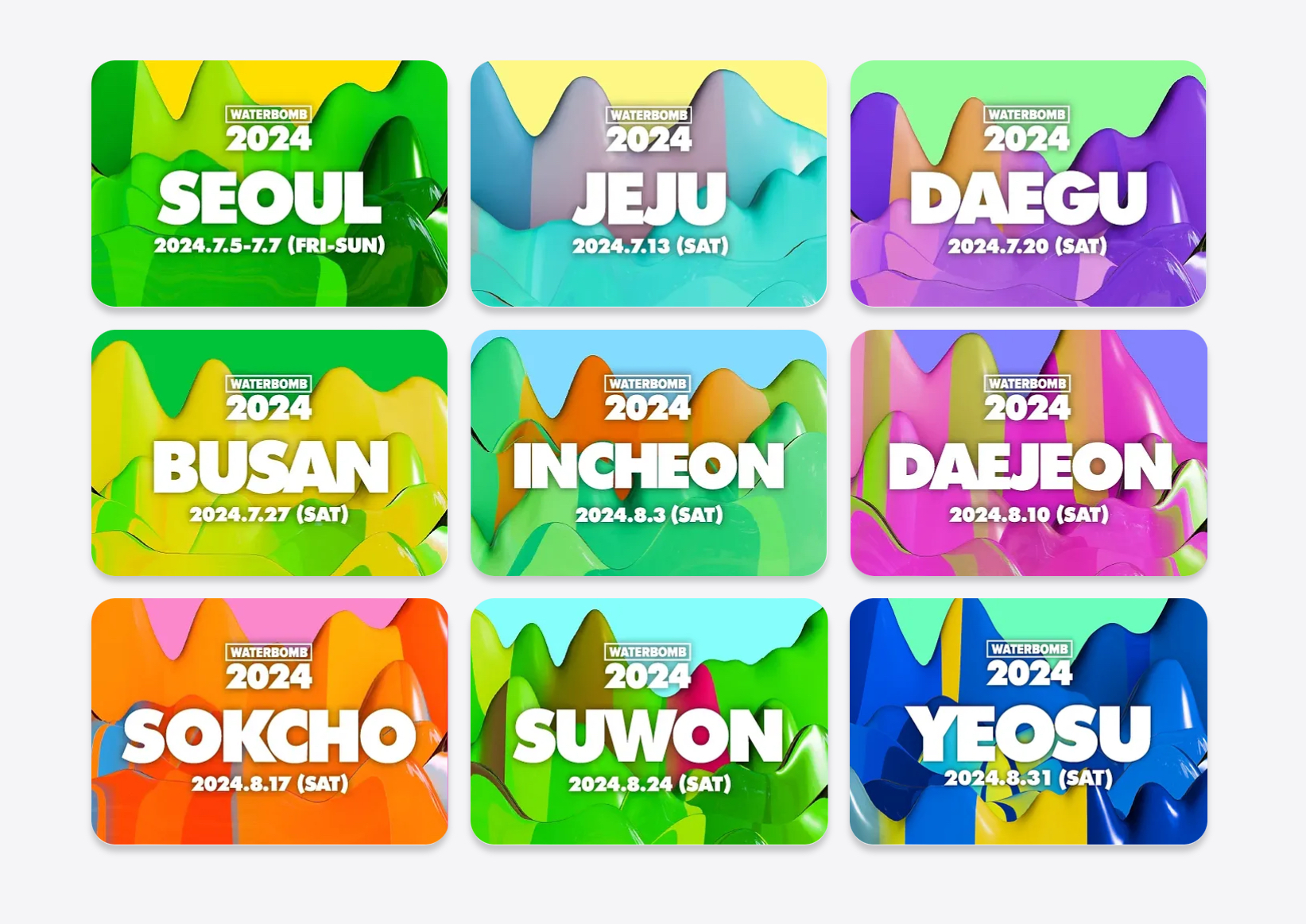 2024 워터밤은 서울을 포함하여 제주, 대구, 부산, 인천, 대전, 속초, 수원, 광주 등에서 개최될 예정입니다.