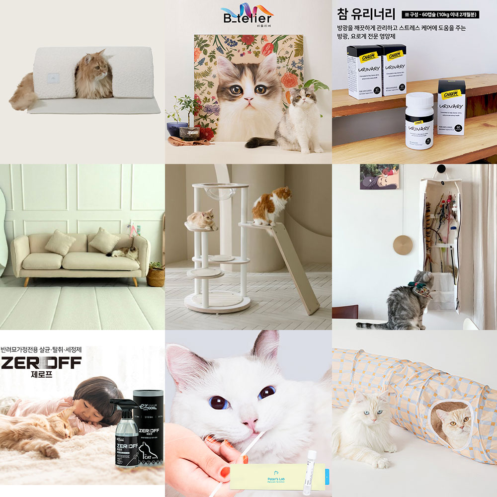 고양이 용품 및 사료 전시 및 판매 다양한 브랜드의 고양이 용품과 사료를 한 자리에서 만나볼 수 있습니다.